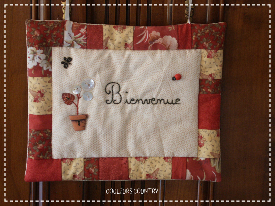 J'ai adaptaté le modèle d'origine, afin de personnaliser mes ouvrages. J'ai aimé sur ce modèle d'associer la broderie au ruban, le patchwork et y mettre des boutons. Le quiltage des rectangles aurait pu être fait, pour les mettre en valeur.